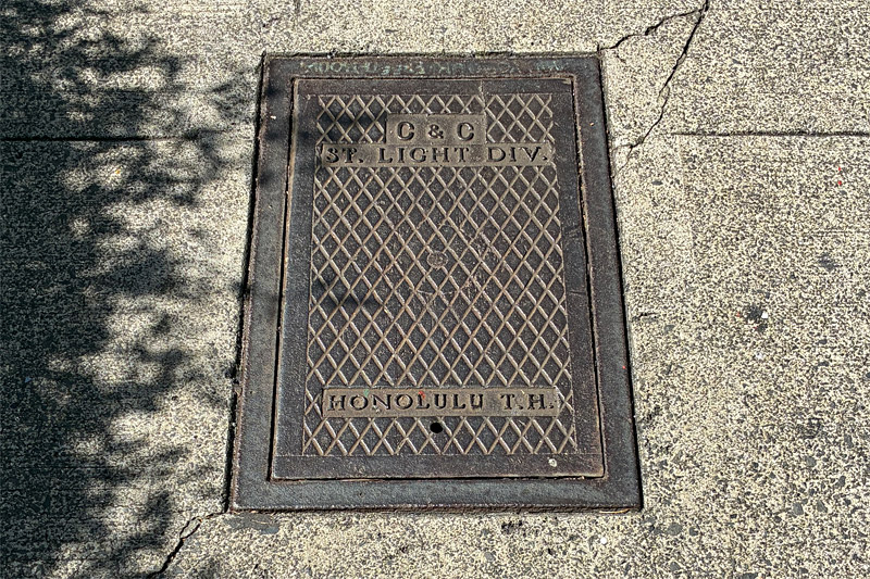 A sewer cleanout cover installed by the Sewerage and Water Board, which was established in 1899.