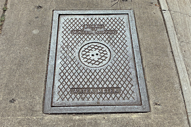 This beautiful water meter box cover was designed by the manufacturer to replace the classic version first introduced in 1921. (The classic version serves as the New Orleans Sewerage and Water Board‘s logo.) The little dome covers an antenna that transmits data to the meter readers.
