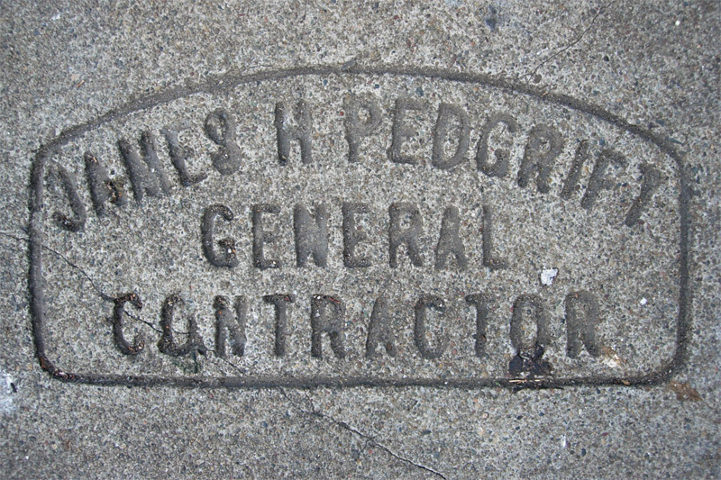 James Henry Pedgrift, General Contractor, was my paternal grandfather. Born 1877 in England, came to California 1902, died in Oakland 1948. When I walked to grade school, Grant Elementary, I would step over his name on the sidewalk every day on Telegraph Avenue near 30th Street. I revisited the site a few years ago and the sidewalk had been replaced with a new store.