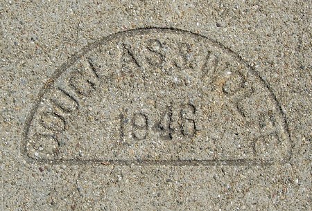 This Douglas & Wolfe mark throws a spanner into my scenario, on which I expounded just yesterday, for the transition in R. G. Wolfe’s career in 1945. Here’s a perfectly standard mark dated 1946. It seems to mean that there were two copies of the stamp. But it might also mean that instead of removing “Douglas” from the stamp itself, Wolfe simply wiped out Douglas’s name from the wet concrete each time he did a job, and for some reason he didn’t do that here. (See my other 1946 Wolfe mark.) Never assume intelligence when you can explain the same thing through the effort to avoid expending energy.