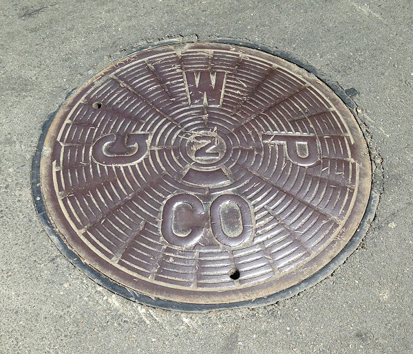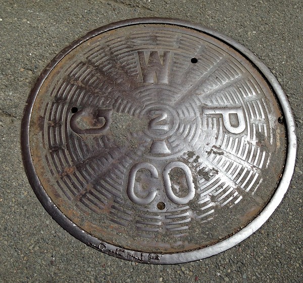 The old Great Western power lines are PG&E property today, but PG&E didn’t replace the utility hole covers. I’ve photographed over a dozen of them all around the old power plant. This is what most of them look like.