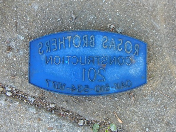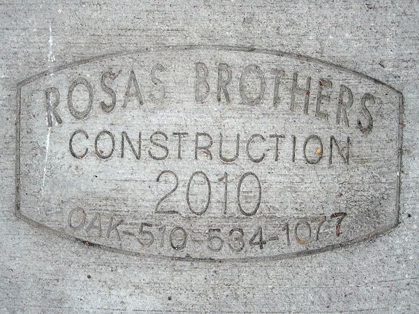 Although they don’t have a website, their sidewalk stamps have their phone number, an effective marketing tool used by Oakland concrete contractors since the mid-1920s. When I called that number, I learned that Victor, Umberto and Luis Rosas are the brothers who started this Oakland-based general contracting business in 2002. The offices are still in a little old house on Coliseum Way by the freeway. Their earliest stamp I’ve seen in Oakland is from 2009.