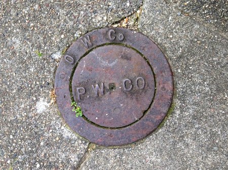 In 1898 the two firms were obliged to merge, with Dingee in charge under his former rival’s name. Less than a decade later, the Peoples Water Company devoured the Contra Costa Water Company. I think this lid used hardware from both Peoples and Oakland water companies, perhaps a fresh cap in an old ring or just mixed inventory in the Peoples warehouse.