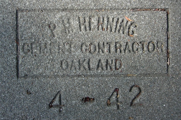 By 1921 he was living in Oakland, working as a clerk. The 1924 directory was the first to list him as a cement contractor, living at 726 15th Street. The next year he was at 5228 Lawton Avenue. The oldest mark of his I’ve found is from 1927. He ran ads in the Oakland Tribune in the late 1920s that would point readers to the address of a recent job, so you could go look at it or talk to the proud new homeowner. His mark was always sturdy.