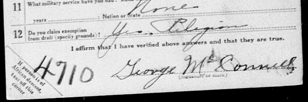 George Caswell McConnell was born in northern Ireland (records conflict on the exact place) in 1889. He married Isabelle Gibson Brown, a native of Dykehead, Scotland, in 1908 and emigrated to America in 1911. Their son William George was born in Chicago in 1912. A second baby, George, died in infancy in 1914.