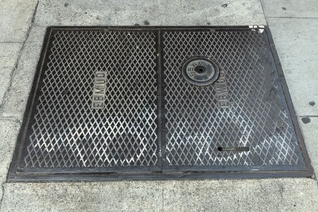 This access cover, next to the Paramount Theater on 21st Street, combines hardware from East Bay MUD and its primary predecessor, the East Bay Water Company. The two leaves look to be the same vintage and installed at the same time. It’s my theory that when EBMUD took the reins of the East Bay’s water system in the 1920s, they inherited a bunch of plumbing stock with the EBWCo logo and just deployed it until they ran out. It helped that local foundries could quickly adapt their existing forms to the new client.