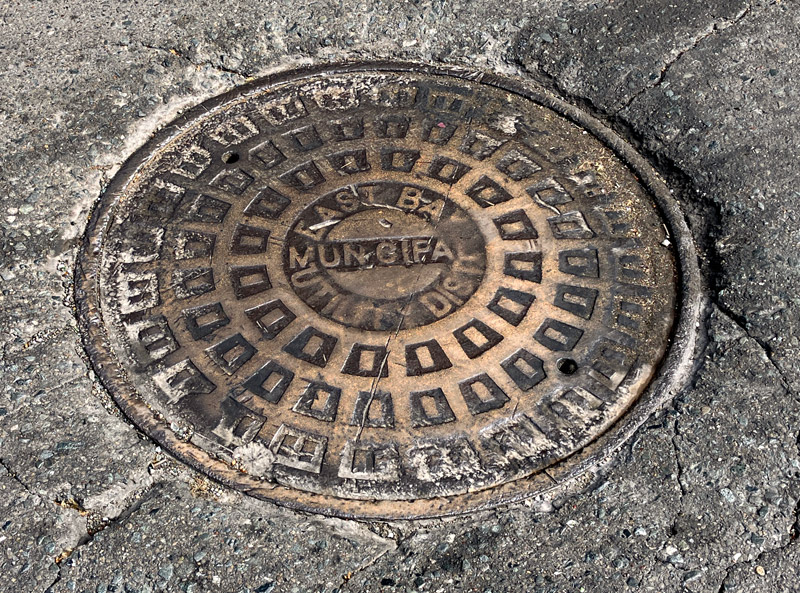 Grand Avenue was closed off today for the 4th of July, giving me a chance to inspect the roadway. This classic access cover near Embarcadero appears to be bronze.