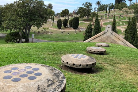 The dark glass disks on top of this family vault are the lighting technology, common in the days before electricity, known as vault lights. I’ve documented vault lights before in their usual setting: Oakland sidewalks, here and here and here.