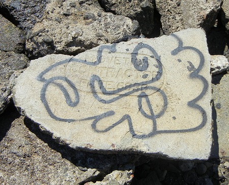 Unfortunately the Kevin Collins Flickr page on Alameda paving marks is no longer there. I’ve recently been checking out paving marks in a few places in Alameda and I’ve found a couple of them that I haven’t yet been able to decipher. I’ll have to keep looking to see if I can find more legible examples.