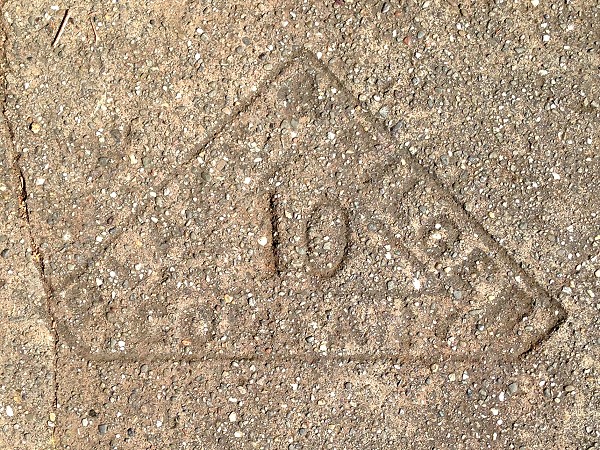 Unlike my other mark from this year, this is a full, well-formed stamp that displays the stars at the ends of the oval. The lot here is empty and the old sidewalk is limited to a small patch, so this mark’s days are surely numbered.
