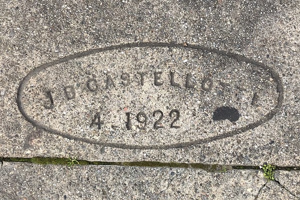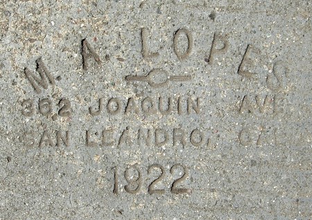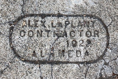 I’m going to put up a bunch of stamps I collected in Alameda last month. As always, I only use non-Oakland stamps to document dates that I haven’t found in Oakland. Alameda has stamps from a lot of sidewalk makers who don’t appear in Oakland. One reason, especially in the old days, is that the city required a $200 bond in order to do business, which kept a lot of artisans away and reserved street work for the already successful and/or well connected.