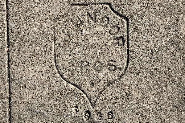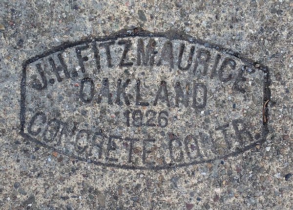 J. H. Fitzmaurice, founded in 1922 and still going strong as a general contractor, was the first sidewalk maker in Oakland to use the barrel-shaped stamp format, which it introduced in 1926 and used into the 1950s at least. Only a handful of this stamp’s first configuration — with “OAKLAND” placed above the center — have stamped dates inside the mark. So I had to capture this one even though I have another example from the Grand Lake neighborhood.