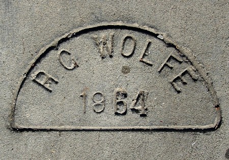 The Goyak Construction Company was in Richmond. Nick Goyak (1892-1968) was a Croatian immigrant from Veliko Brdo who arrived with his family in 1929. This mark is in the roadway along the curb. (Thanks to Ken for spotting this one.)