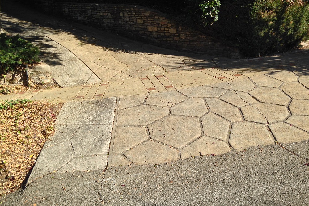 As a geologist, I look at this and infer a sequence of events. First came the sidewalk, installed by the developer. Then came the main part of the driveway, where the concrete worker tried to tie the tessellation to the divisions in the sidewalk and also tried to match the sidewalk’s color. Then came the worker who widened the driveway. He exercised less care in matching the colors, and less creativity in drawing grooves. Finally came the asphalt.
