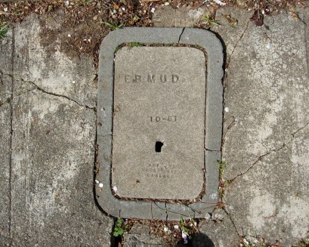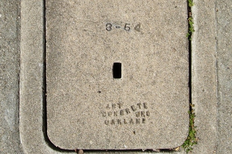 But there are records on the ground that tell me more. East Bay MUD was a steady customer of Art Concrete Works, and for a while the company stamped dates on its meter-box covers!